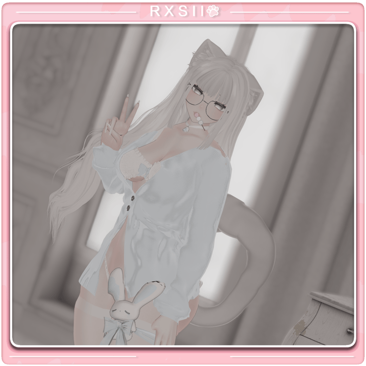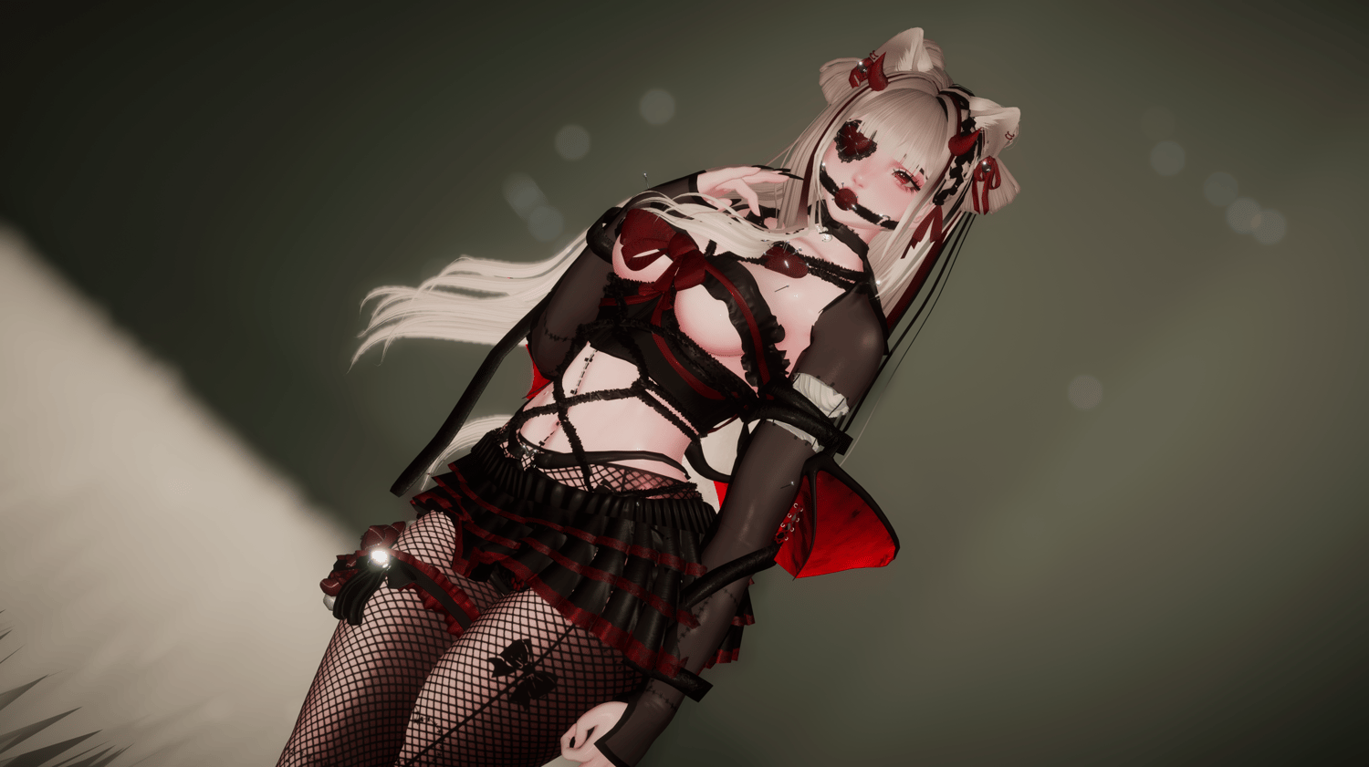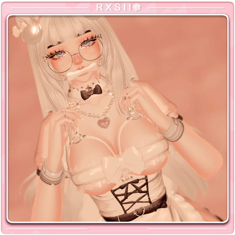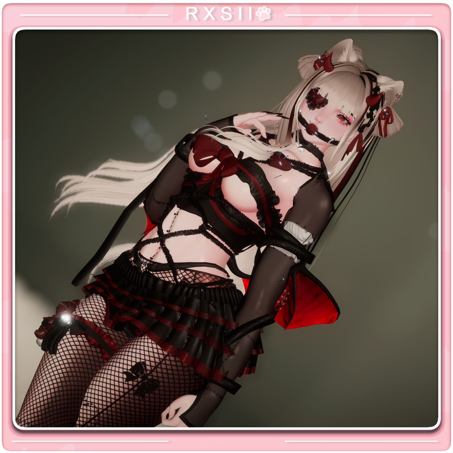 heads- sivka (realistic/anime) / cicieeea / rxsi (heads are heavily edited, no reuse) | lip text/makeup/velvet meoou | | body- zinpia (no reuse) | skin texture- yingyangvr/lunanyxia/zinpia | texture- frenchies & sicky | hair1/2/bangs- sleepy | hair3- saikura | hair4- nessy | top1- honeylab | top2/bottom2/corset1/garter/ears1/tail1/harness- milkymutt | top3/bottom1- apyr | top4/5/bottom3- aquariandoll | top6/choker- fooly | ears/tail2- winks | demonset/bear- bunisu | wings-flexuh | witch hat/headband/lingerie/heels1/eyepatch- aikavr | cathood- hysteria | heels2/corset2- nauuki | doll- suki | corset pierce- ante | gag/ropes/cuffs- meowmi (commissioned no reuse) | follower- beartrap (commissioned no reuse) | tummy pull setup- douji | facetracking- luvvr |
